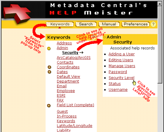 Keywords work like the index at the back of a book. For a book on Metadata Central, you would go to the back, then to the A's perhaps, find "Admin", and then see "Security" under that. Instead of referring you to a page in a book, Help Meister lets you click on the keyword "Security" and go right to the page about it. This is also how most desktop software help works. For MS Windows programs, for example, you click on "Help" and then "Contents" to see the keyword index. In the picture below, the user has clicked on the "Keywords"