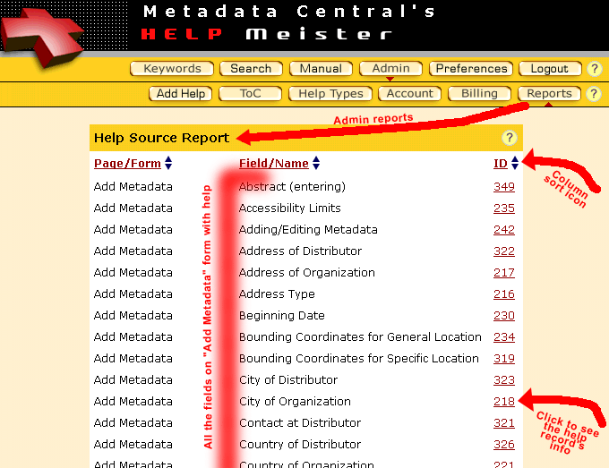 By sorting the "Field/Name" column, you quickly see the several listings of a help record as sourced from several pages and forms. For a quick peek at the help record, click its ID. Tip: bring up the subject page or form in another browser and use the report to make sure you provided help for all the fields and sections on the page or form that need it. To close this slide show, click on Get Help, the last slide along the top, to see how you can get online help regarding the report below. |