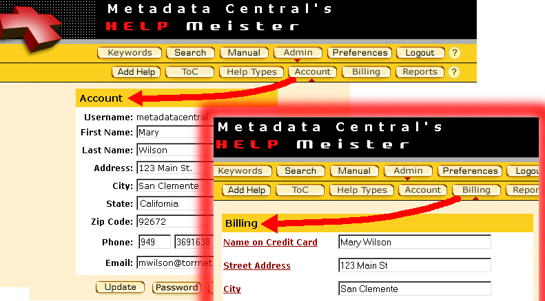 On the Admin's sub-command menu line, you can click on the "Account" button to view basic information about your Help Meister account. This is where you can change the company name that forms part of the Help Meister header, "Metadata Central" in the case study example. It is also where you can change your password, email, etc. The "Billing" button is where you can change your credit card, just update its expiration, or close the account. |