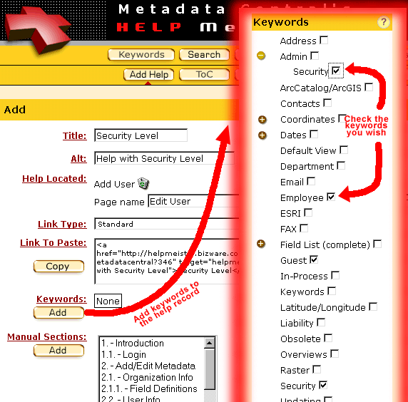 For a new website, most administrators add all the help into Help Meister first, then produce the keyword lists (see Edit Keywords slide), and then assign keywords to the help records they entered earlier. |