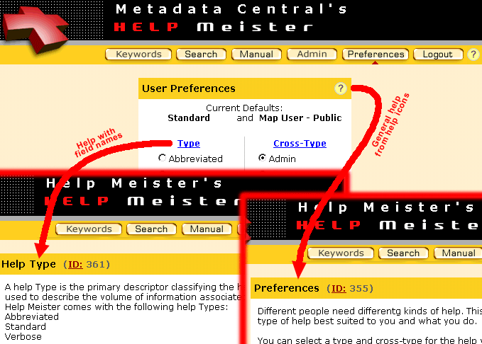 No surprise, Help Meister is used to provide help to use Help Meister. Every single field on every form, in fact every page, has a pop-up help link. Click on any such field name and see a pop-up help screen as shown for the "Type" field below. At the top-right of each page is a help icon